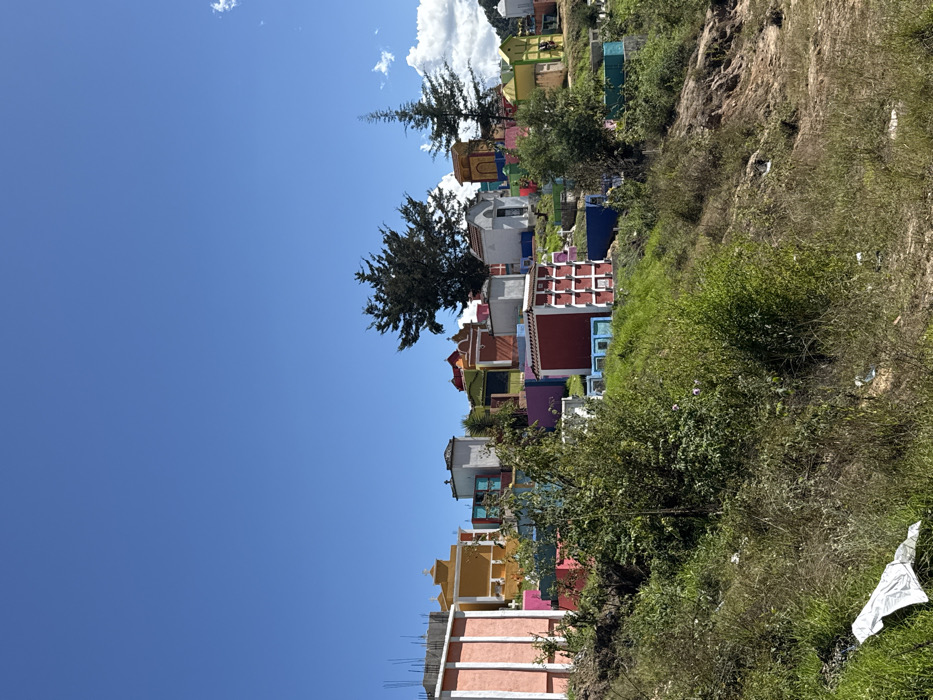 A hillside cemetery under a clear blue sky displays brightly colored tombs