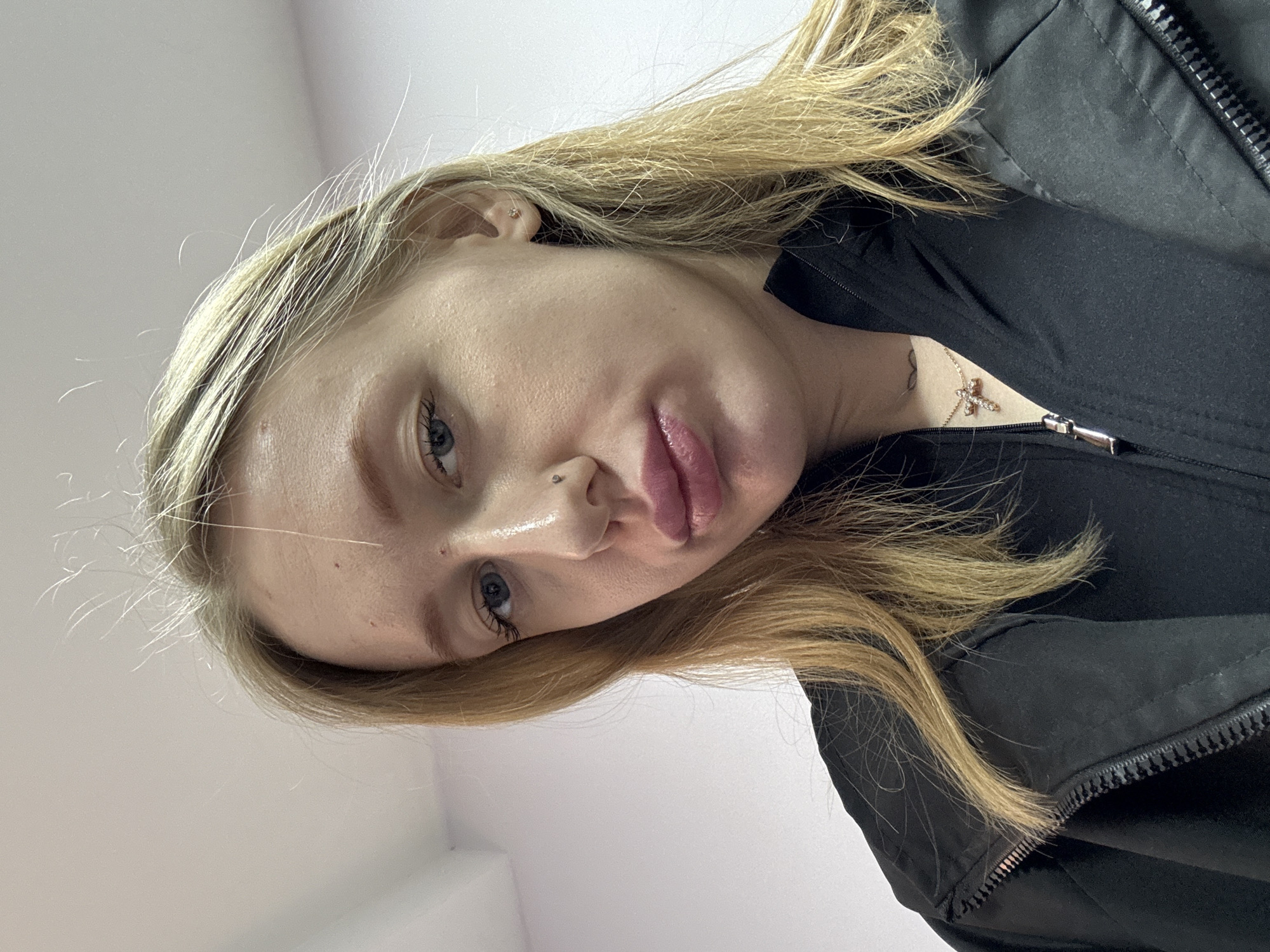 A blonde-haired individual wearing a black jacket is looking downward toward the camera