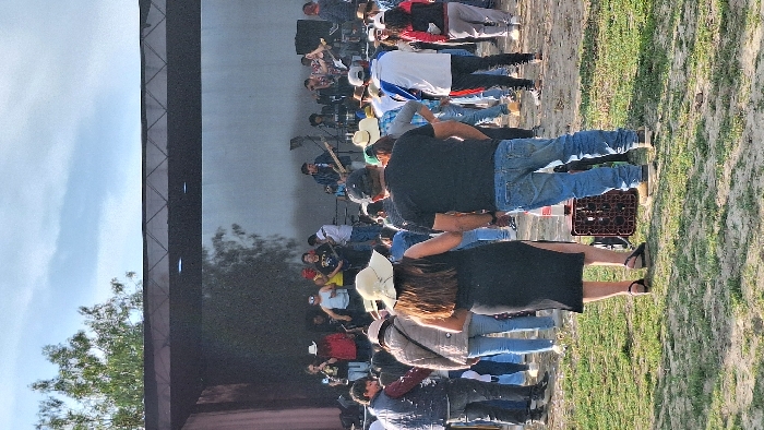 crowd of people gathered in front of a stage in Sabandía, Peru, located at coordinates -16.448 latitude and -71.474 longitude. The stage is made of metal and has a white backdrop. Several people are standing on stage, some playing musical instruments. The crowd is mostly made up of women and men, many wearing hats. Some people are talking to each other, while others are watching the performance on the stage. The ground is covered in grass and dirt. There is a crate of empty plastic bottles in the foreground.