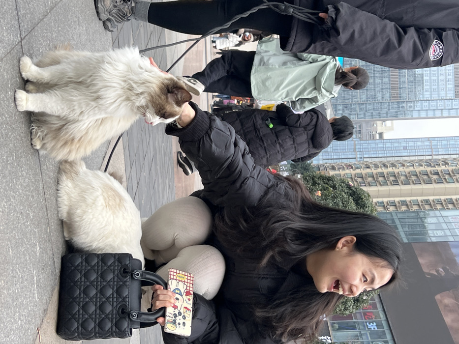 A woman kneels on a paved area, petting a large, fluffy dog with brown and white fur. She is wearing a black puffer jacket and light-colored leggings. In her left hand, she holds a black quilted handbag and a phone with a cartoon-themed case. Other pedestrians are walking nearby, and tall buildings are visible in the background. The woman is smiling and appears to be enjoying interacting with the dog.