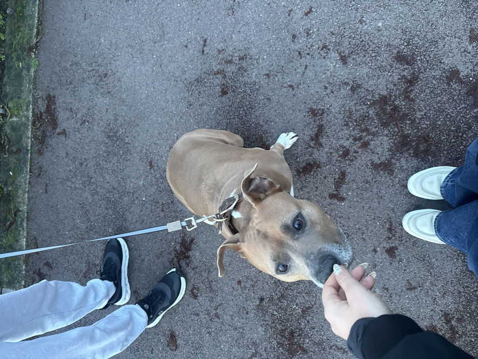 From an overhead perspective, a light brown dog on a leash looks up at a hand holding a treat. The dog has floppy ears and a white-tipped tail. Three pairs of legs surround the dog. One wears gray sweatpants and black sneakers with white soles, another wears blue jeans and white loafers, and the third has black clothing. The background is a gray asphalt surface.