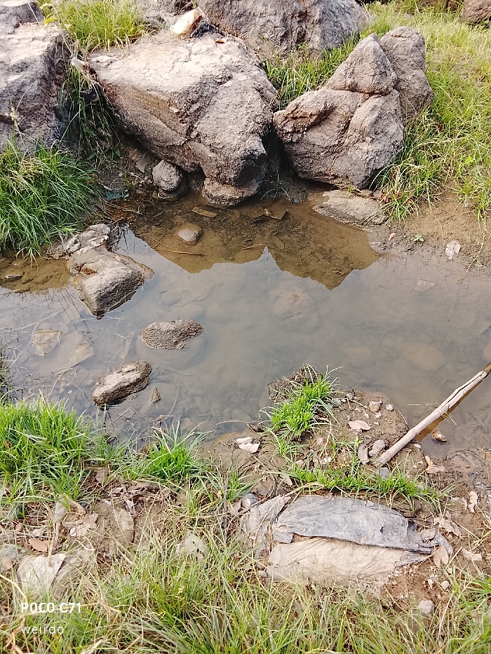 A small body of water reflects the surrounding rocks and vegetation. Rocks of varying sizes are arranged along the water's edge. Green grass and other small plants grow around the water. Debris and a stick are visible near the edge of the water on the right side of the image. The water appears murky, with some rocks visible beneath the surface.