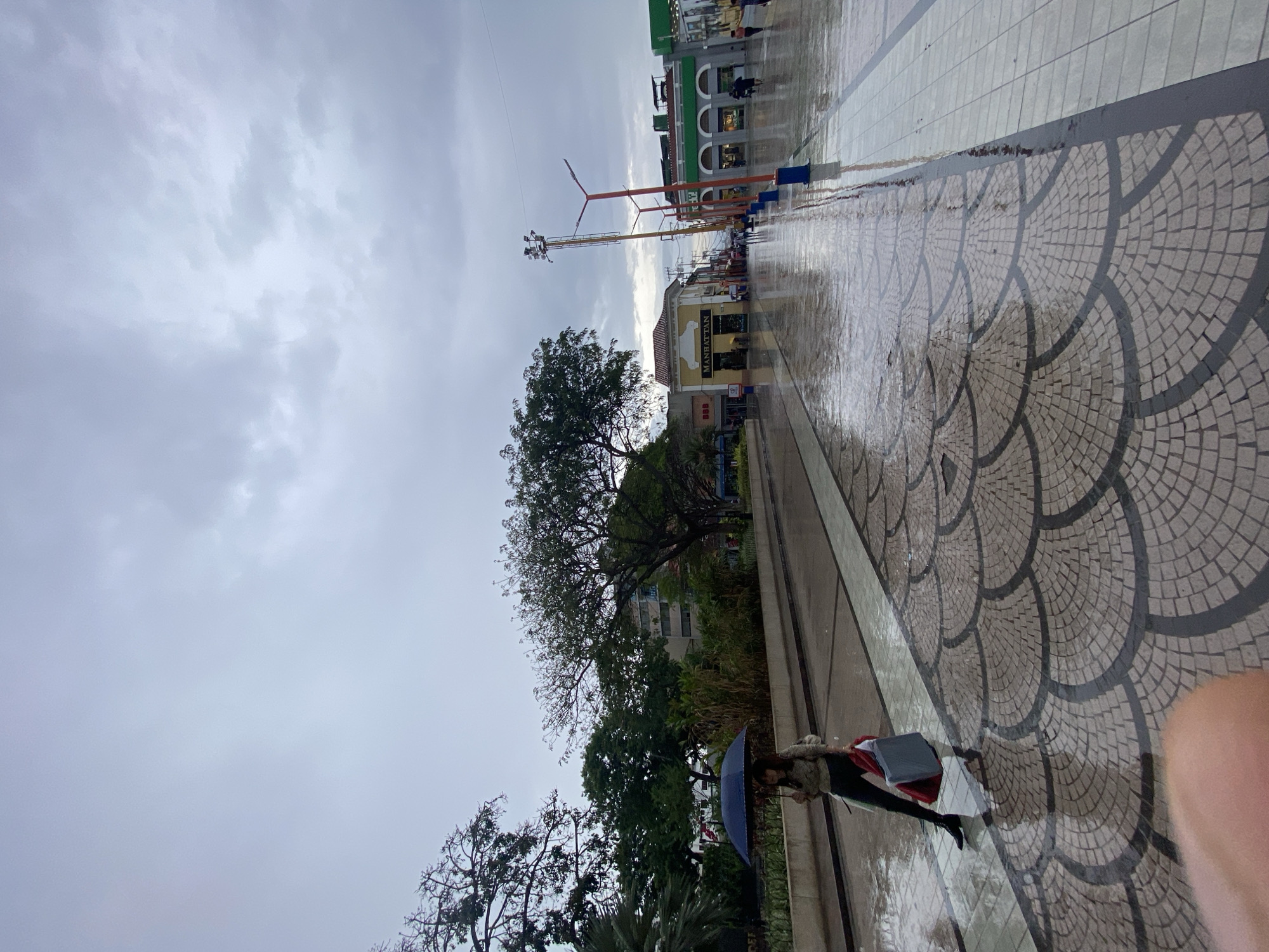 street scene in Valencia, Venezuela on a cloudy, possibly rainy day. The pavement is patterned with a large, repeating semi-circular design of light-colored stones bordered by dark lines. The pavement is wet, suggesting recent or ongoing rainfall. A person is walking along the edge of the pavement, carrying a dark-colored umbrella and a gray bag. Buildings line the other side of the street, including one with the name "MANHATTAN" visible on its facade. There is a tall structure with a red and orange framework, potentially a ride or attraction, rising into the sky. Trees are present, adding greenery to the scene. The sky is overcast with gray clouds.