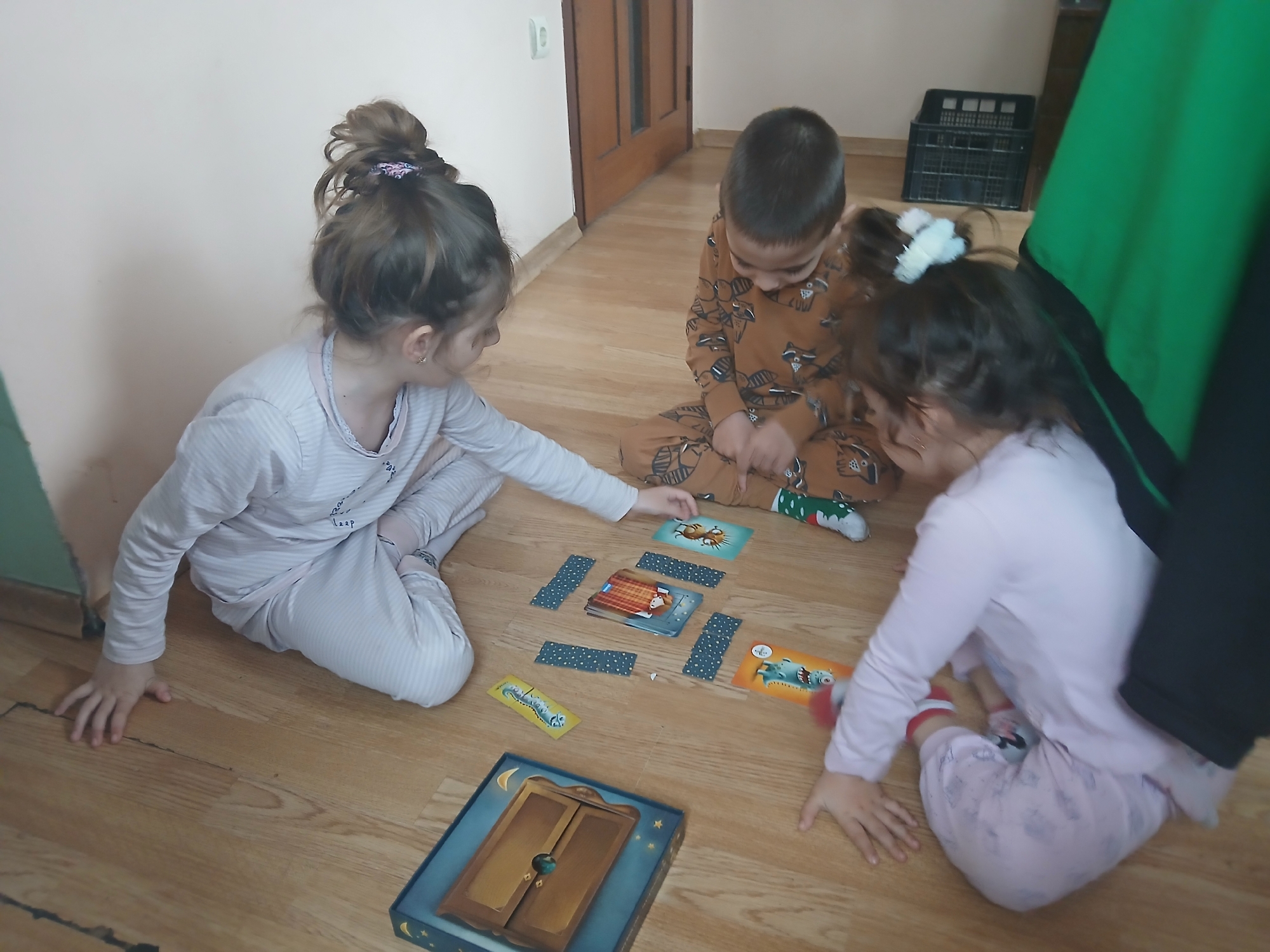 Three children sit on a wooden floor, engaged in a game. The child on the left wears light-colored pajamas, and has their hair in a bun. The child in the center wears brown pajamas with a raccoon print and has short dark hair. The child on the right wears light pink pajamas and also has their hair in a bun. A game board and cards are arranged between them. A brown wooden door and a black crate are visible in the background. A green and black curtain hangs to the right. The location appears to be indoors, likely a residence. There is no information to confirm this photo was taken in the city of Obrochishte, Bulgaria.