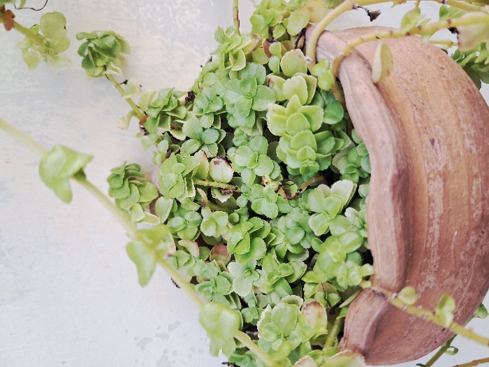 A close-up shows a clay pot spilling over with vibrant green foliage. Small, round leaves create a dense, textured mass. Trailing stems, lined with similar leaves, cascade down and to the side, creating a sense of organic movement. The rough, earthy texture of the clay contrasts with the soft, vibrant green of the plant, suggesting a natural and cultivated setting.
