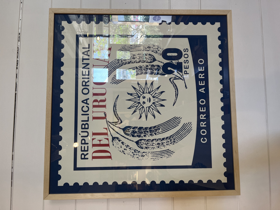 A framed artwork, approximately rectangular, hangs centrally on a white horizontal shiplap wall. The artwork is a large-scale reproduction of a Uruguayan postage stamp, encased within a light-colored wooden frame and covered by glass, which displays reflections of an exterior scene including sky and foliage. The stamp design features a dark blue border with a simulated perforated edge around a cream-colored interior field. At the top, in dark blue, is the text "REPÚBLICA ORIENTAL" followed by "DEL URUGUAY" in red. The center depicts a stylized Sol de Mayo (Sun of May) with a face, flanked by two bundles of what appear to be wheat or grain stalks in dark blue. In the lower right corner, the value "20 PESOS" is printed in dark blue. Along the bottom, the phrase "CORREO AEREO" is centered in dark blue. This scene is located in Faro de José Ignacio, Uruguay.