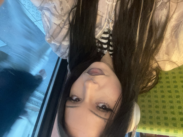 A front-facing selfie captures a young individual, likely female, with long, dark hair accented by lighter streaks, wearing light-colored over-ear headphones. The subject's face features prominent winged eyeliner, dark lipstick, a septum piercing, and multiple studs piercing the left eyebrow. They are dressed in a black and white striped top beneath a light-toned, possibly patterned, zippered hooded jacket, featuring a stylized cross-shaped zipper pull. The subject is seated inside a vehicle, indicated by a green, geometrically patterned fabric seat visible on the left side of the frame. To the right, a window reveals a blurred exterior environment. Through the window, a partially visible figure in dark upper clothing and light lower garments is captured in motion, suggesting movement of either the vehicle or the passerby. Below this figure, a segment of a platform edge with distinct tactile paving (raised circular bumps) is visible, consistent with a train station or bus stop. This scene is located within a public transport vehicle, likely a train or bus, at or in the vicinity of a station in Enghien-les-Bains, France.
