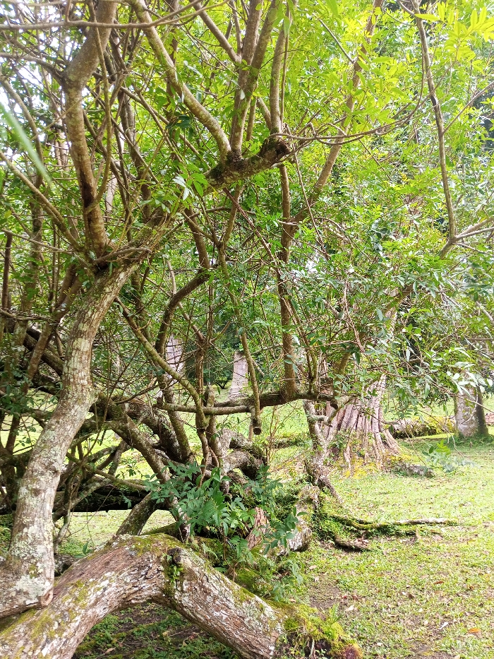 The image depicts a densely vegetated outdoor scene in Serchhip, India. A large, gnarled tree trunk or root, heavily encrusted with green moss and white lichen, extends horizontally across the lower foreground. Numerous deciduous trees with light brown, multi-branched trunks and vibrant green foliage dominate the central and upper portions of the frame, creating a layered, interwoven canopy. The ground beneath the trees is covered in green grass. In the mid-ground, visible through the dense foliage, is a light-colored, angular structure, possibly constructed of stone or concrete, partially obscured. No human figures or discernible activity are present within the scene.