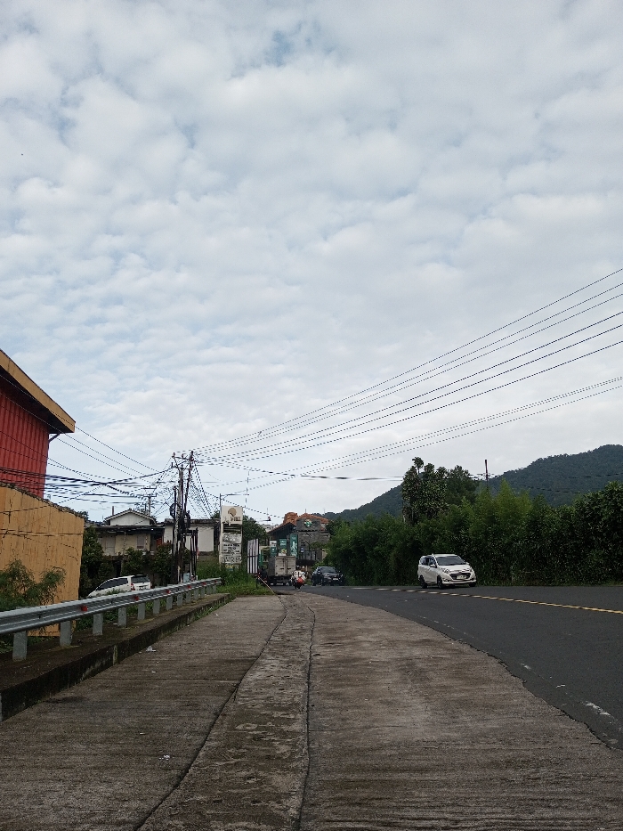 A road curves to the right, flanked by a concrete walkway on the left and dense green vegetation on the right. Utility poles and wires crisscross the sky. Several parked cars are visible near buildings and signage along the roadside. A hill covered in trees forms the backdrop against a cloudy sky.
