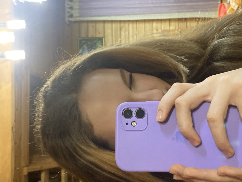 The image depicts a close-up, reflected view of an individual taking a selfie indoors in what is identified as Прикамский, Russia. The subject is a female with long, brown hair, parted centrally. Her left hand is visible, holding a light purple iPhone, which obscures the left side of her face. The phone's dual camera system and the Apple logo in a matching purple case are clearly visible. Her right eye is open and appears to be winking or squinting, while the remaining facial features are largely out of frame or covered by the phone. The background, reflected behind the subject, features horizontal wooden paneling on the walls. A multi-bulb light fixture with frosted shades is visible in the upper right quadrant of the reflection. A small framed picture hangs on the wooden wall, and a light-colored curtain is partially visible on the far right. Indistinct objects, including a red container, are present in the lower right background.
