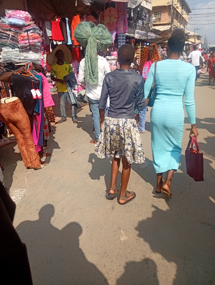 The image displays an active outdoor market street in the city of Fegge, Nigeria, under bright daylight conditions, evidenced by strong shadows cast on the asphalt road surface. The street is populated by multiple individuals and lined with market stalls. In the immediate foreground, two individuals walk away from the camera. The person on the right wears a light blue, long-sleeved, ribbed knit dress and light-colored flip-flops, carrying a maroon fabric bag in their left hand. To their left, another individual wears a dark grey, three-quarter sleeve top, a light-colored skirt with a blue, white, and brown floral or abstract pattern, and brown sandals. In the midground-left, a male vendor with dark skin wears a wide-brimmed straw hat and a yellow t-shirt, holding up dark clothing items, possibly trousers, for display. Adjacent to him, market stalls are visibly packed with stacks of folded clothing, predominantly in pink, and other garments hung from racks under a green canvas awning. To the right of the vendor, another male individual, viewed from behind, wears a white shirt and light blue jeans, balancing a large, green, mesh-like bundle or bag on his head. The background reveals additional pedestrians and multi-story buildings, likely commercial or residential, lining the street further down. The road surface is paved and shows minor debris.