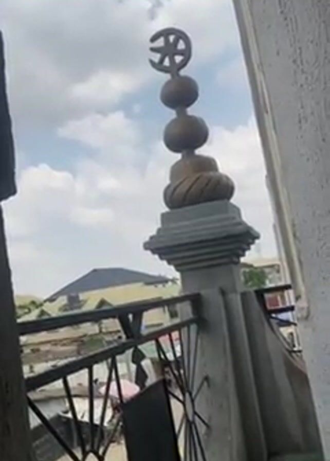 decorative architectural feature, likely atop a building. It's a gray, stacked design with a crescent moon and cross at the top, followed by three rounded shapes, and a twisted base. The feature sits on a balustrade overlooking a cityscape with buildings of varying heights and materials, under a partly cloudy sky. The camera pans to show a view of the neighborhood from behind a window with bars, and then returns to the architectural feature.