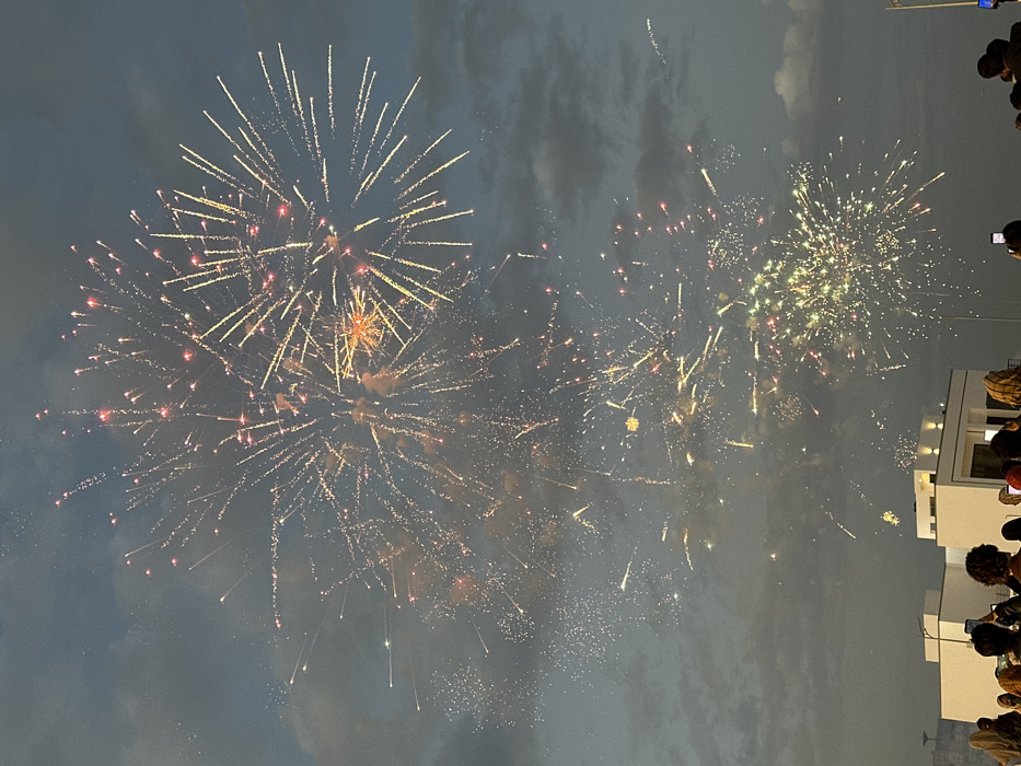 Fireworks burst in the night sky, illuminating the scene with vibrant golds, reds, and whites. The displays vary from large starbursts to more concentrated bursts of light, creating a dynamic and festive atmosphere. Along the right edge, silhouettes of people are visible, some holding up phones to capture the spectacle. A white building sits in the foreground, adding a sense of scale to the expansive display. The cloudy sky provides a backdrop for the colorful explosions.
