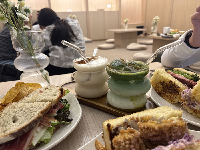 A table is set with a variety of food and drinks. Two layered drinks with glass straws stand on a wooden tray beside sandwiches and chips. One drink is beige with a sprinkle of dark powder on top; the other is green with ice cubes. Various sandwiches are arranged on plates. The background features light wooden walls, low tables, and floor cushions in a softly lit setting. People are seated around the tables in the background.