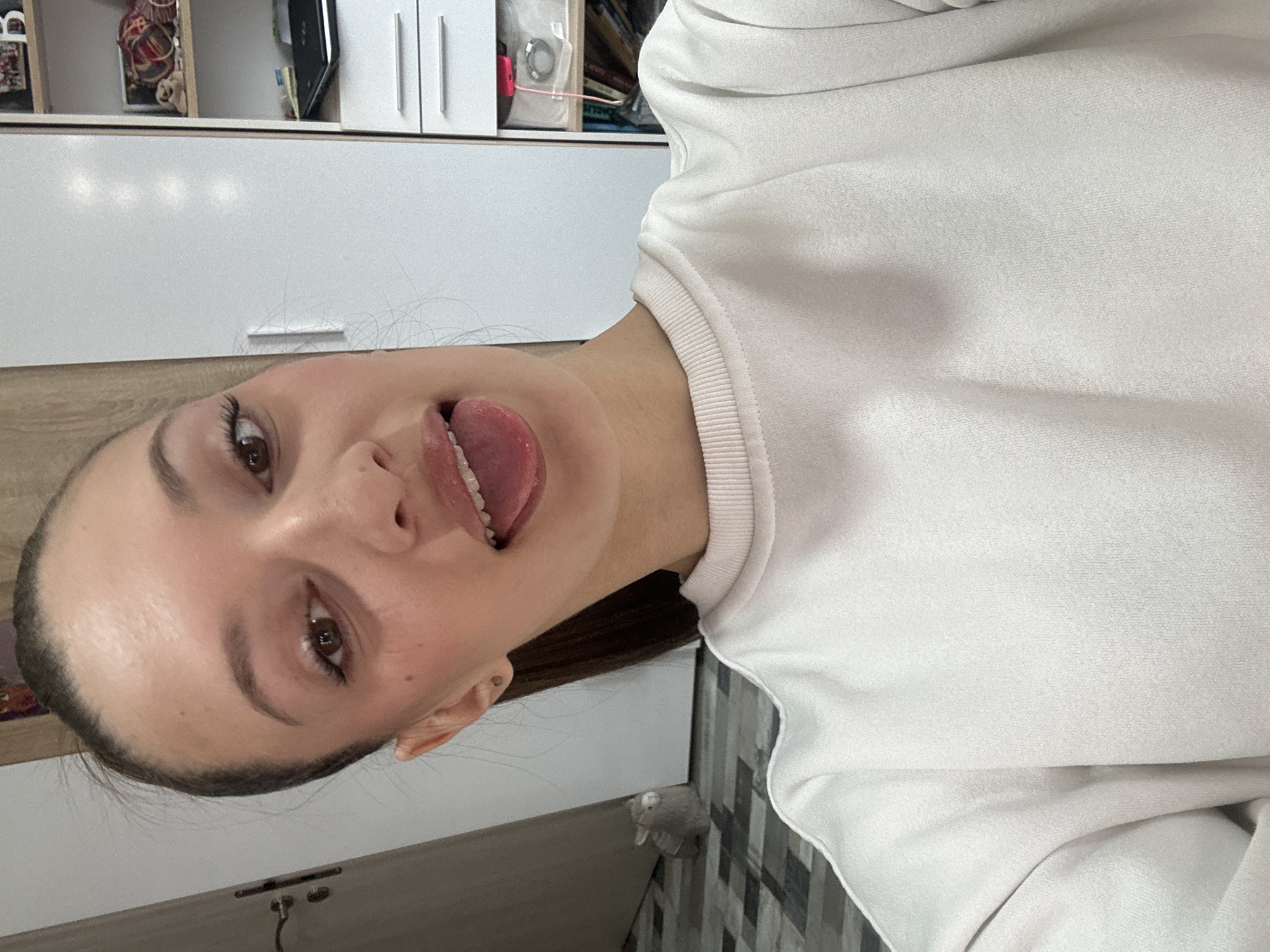 A woman with brown hair pulled back is sticking her tongue out toward the camera. She is wearing a white sweatshirt. The background includes white cabinets and a tiled wall. The location is likely a domestic interior and there is no information to link to Pernik, Bulgaria.