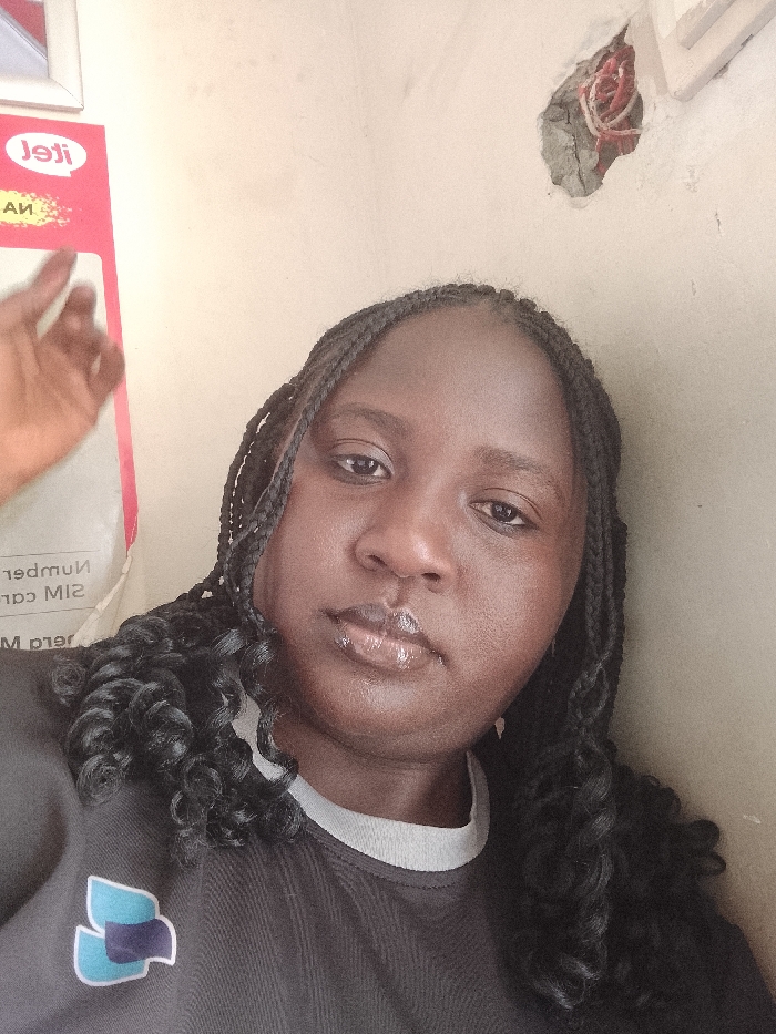 The image depicts a close-up portrait of an adult female in an interior setting. She has dark skin, brown eyes, and dark braided hair styled with some curls, parted down the middle. Her lips have a glossy appearance, and her expression is neutral as she looks directly at the camera. She is wearing a dark-colored, possibly black or dark grey, long-sleeved top with a visible light-colored crew neck collar. A light blue and dark blue logo or graphic is present on the left side of her chest area. The background consists of a light-colored wall, possibly beige or off-white. In the upper left quadrant, a portion of a white-framed object is visible. Below it and to the right, a red and white sign or poster, bearing reversed text, is partially visible. The word "iTel" is discernible in white on the red background, along with other reversed text such as "Numbep red SIM car" and "prer". A hand, possibly belonging to the subject, is positioned near the center of the sign. In the upper right quadrant of the background, a rough, irregular hole in the wall exposes coiled red electrical wires. The precise location within Fagge A, Nigeria, cannot be determined from the visual evidence alone; however, the scene suggests an indoor environment.