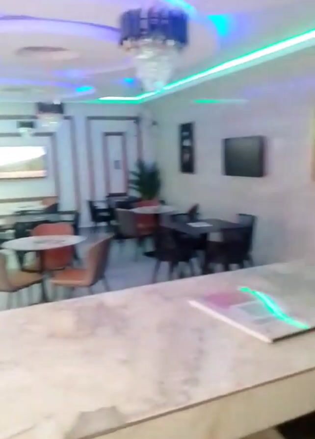 interior of a cafe or restaurant from behind a marble-topped counter. Tables and chairs are arranged in the dining area. Some tables have round tops, others are square or rectangular. Booth-style seating is visible along one wall. The ceiling features decorative lighting with blue and green accents. There are framed pictures or televisions on the walls. One television is displaying an image. A menu sits on the counter in the foreground. The scene appears empty of customers at the time of filming.