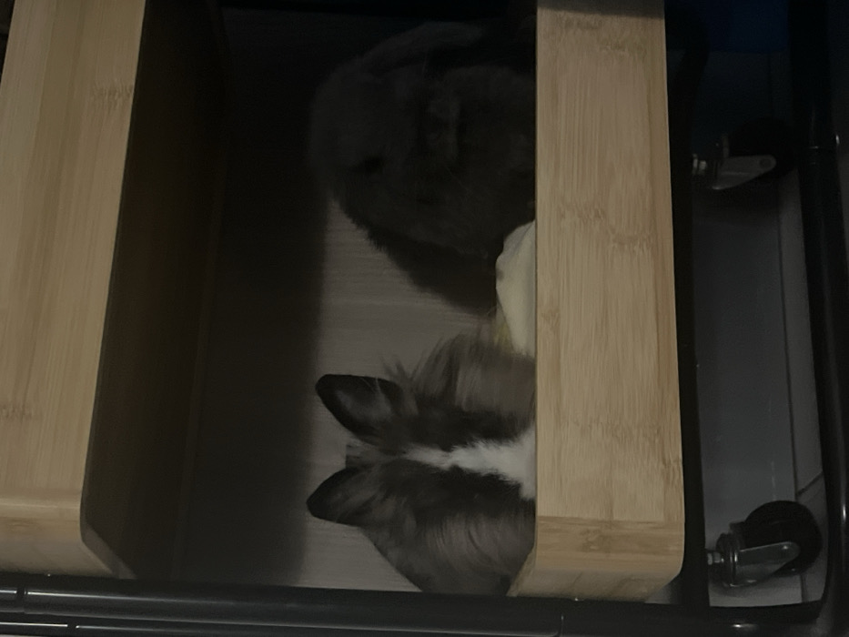 A gray and white rabbit sits inside a wooden drawer. Only the rear half of the rabbit's body is visible. Fluffy ears and a white stripe on the back can be seen. The drawer is made of light brown wood with rounded corners and is part of a piece of furniture with black metal framing and wheels. The photo is taken from above, looking down into the drawer.