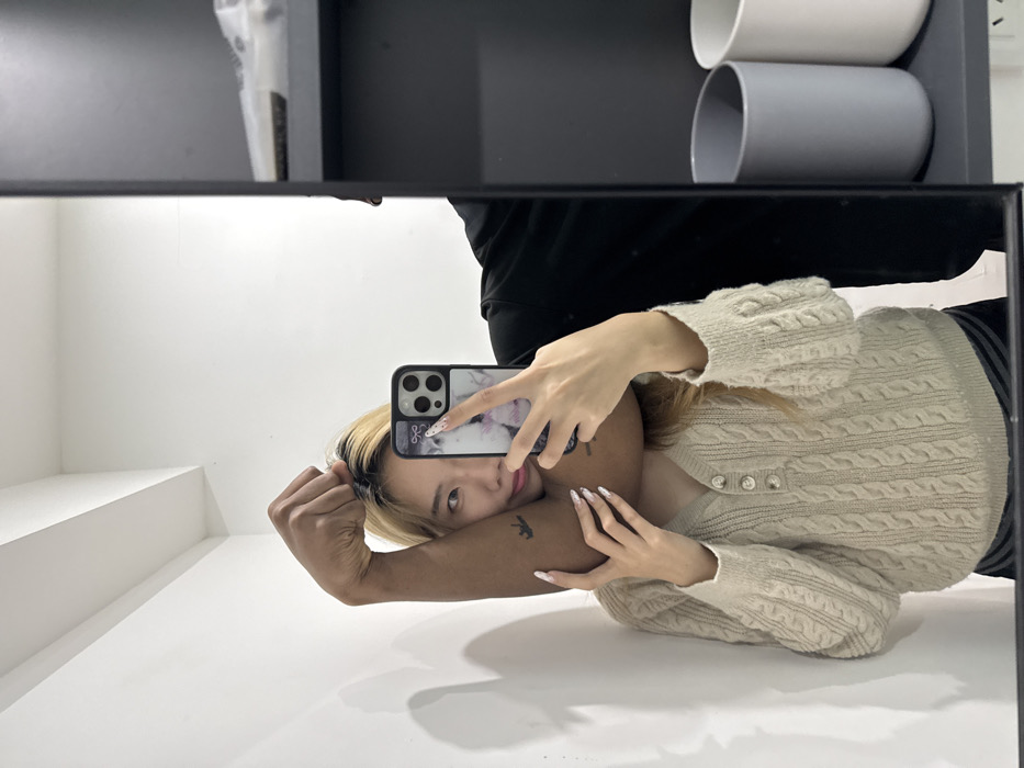 This image is a mirror selfie taken indoors in Yuzhong District, China. The central subject is a woman, appearing to be East Asian with blonde hair, who is smiling and looking towards the camera of her smartphone. She is wearing a beige cable-knit V-neck sweater with three light-colored buttons. Her left hand, adorned with long, light-colored fingernails featuring a decorative pattern, holds a dark-colored smartphone with a distinct patterned case, positioned to capture the reflection. Partially obscuring the woman's right shoulder and neck area is a dark-skinned arm with a clenched fist. A small, dark tattoo, possibly depicting a figure or object, is visible on the bicep or forearm of this arm. The rest of the individual attached to this arm is largely out of frame, with only a portion of a black garment visible to the right of the woman. The reflected environment includes a plain white wall with a visible corner on the left side of the frame. On the right, a black shelving unit is reflected, displaying two cylindrical containers or cups: one light grey and one white.