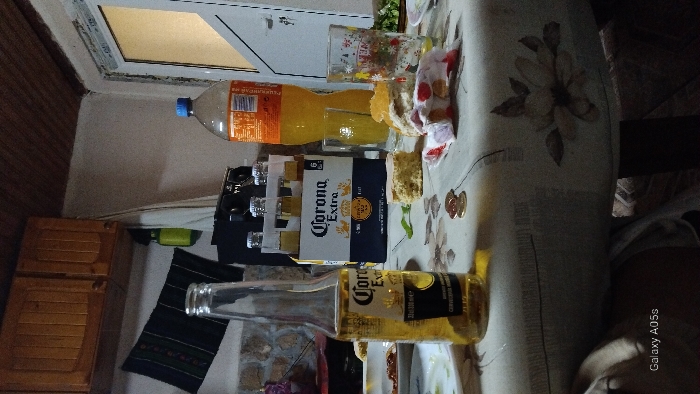 The scene depicts an indoor setting, specifically a dining or gathering area in Oreshene, Bulgaria. A light-colored tablecloth with a recurring pattern of light brown floral designs covers a table, which is the primary focus. On the table, a clear glass bottle of "Corona Extra" beer stands upright, appearing partially consumed. To its right, a cardboard six-pack carrier for "Corona Extra" beers is present, containing several bottles. A large, clear plastic bottle with a blue cap holds an orange-colored beverage, likely soda or juice, with a partially visible label containing Cyrillic script. Two drinking glasses are positioned near the orange beverage bottle; one is clear, and the other features a colorful floral pattern. Food items visible on the tablecloth include two pieces of a light-colored, crumbly cake or bread, one appearing as a cut slice and the other as a broken fragment. A crumpled white cloth or napkin with red markings lies between the cake and the floral glass. Two metallic coins, consistent with Bulgarian Leva, are placed on the tablecloth. A few green leaves are scattered on the surface. A white plate with remnants of food is partially visible on the far left. The background features a textured wall on the left, possibly stone or stone-effect, above which two light-colored wooden wall cabinets are mounted. A dark, patterned textile hangs on the wall below the cabinets. To the right, a white PVC window or door frame is visible, leading to an illuminated area beyond. Above the beer carrier, a dark electronic device, possibly a speaker or radio, is situated on a shelf or surface. The ceiling is paneled with dark wooden slats. No individuals are visible in the image. The general lighting suggests an indoor setting, possibly during the evening.