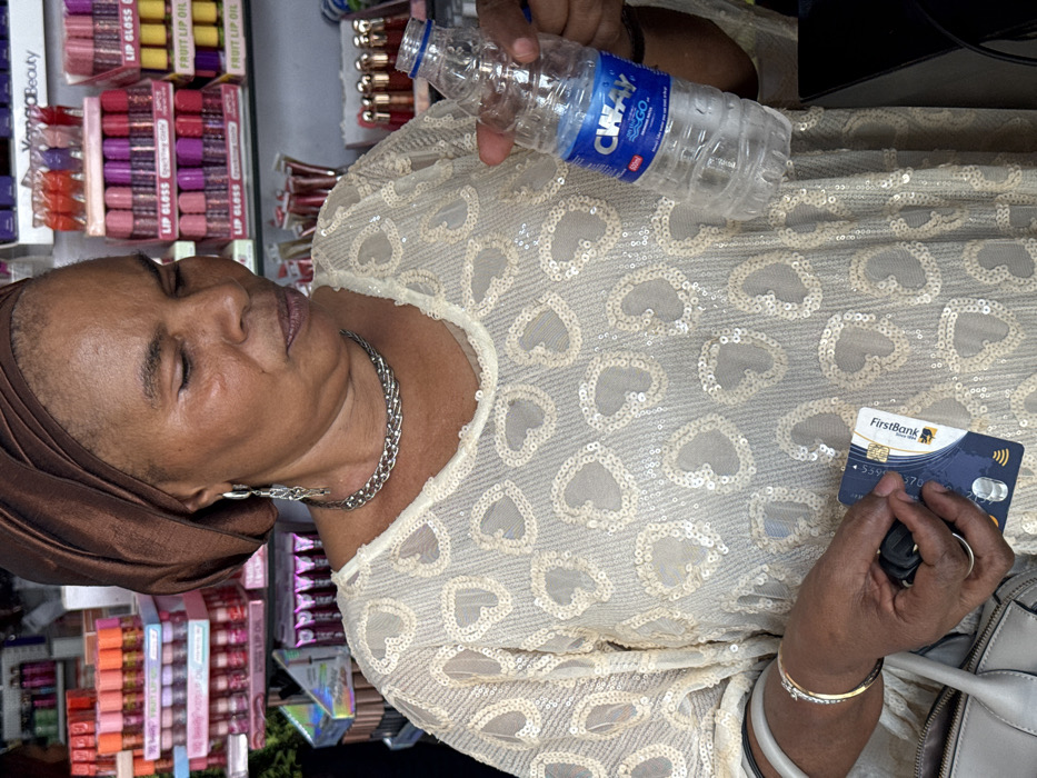 An adult female, with dark skin and wearing a brown headscarf, is depicted inside a retail store in Galadimawa, Nigeria. She wears a cream-colored top adorned with heart-shaped sequins, a silver chain-link choker necklace, and a long silver earring on her left ear. Her left hand holds a blue FirstBank debit card along with a set of silver keys. Her right hand grasps a clear plastic CWAY 500ml water bottle. The background displays shelves fully stocked with various beauty products, including multiple brands of lip glosses and fruit lip oils, some labeled "Yemzi Beauty" and "Sparkling Gloss," indicative of a cosmetics or general merchandise store. The woman's attention is directed downwards and slightly to her right.