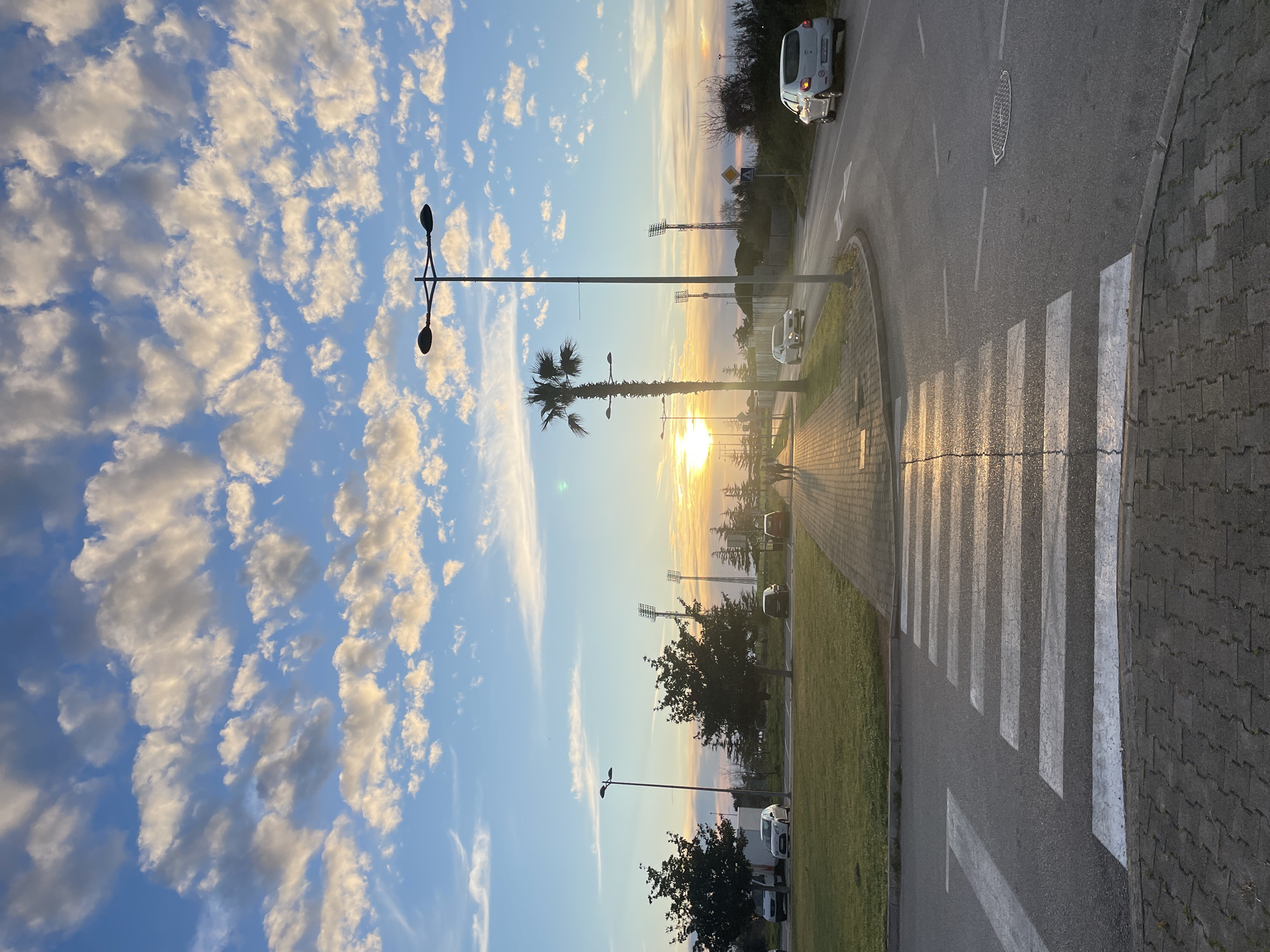 n outdoor urban scene likely taken during sunset or sunrise, given the warm glow in the sky. The sky is predominantly blue with scattered white clouds, indicating fair weather. A road runs horizontally across the image, with a pedestrian crossing marked by white stripes in the foreground. On the left side of the road, there's a green space with trees and a palm tree. Several lampposts are visible along the road and within the green space. Several cars are parked along the road. In the distance, one can see what appears to be stadium lighting towers, which might suggest the presence of a sports facility or stadium. Given the location in Bar, Montenegro, it is possible that the stadium lighting towers are used for a local soccer or football stadium. The buildings that are in the distance are of a small nature, thus this does not appear to be a highly urbanized area in the city of Bar. A manhole cover can be seen on the road.