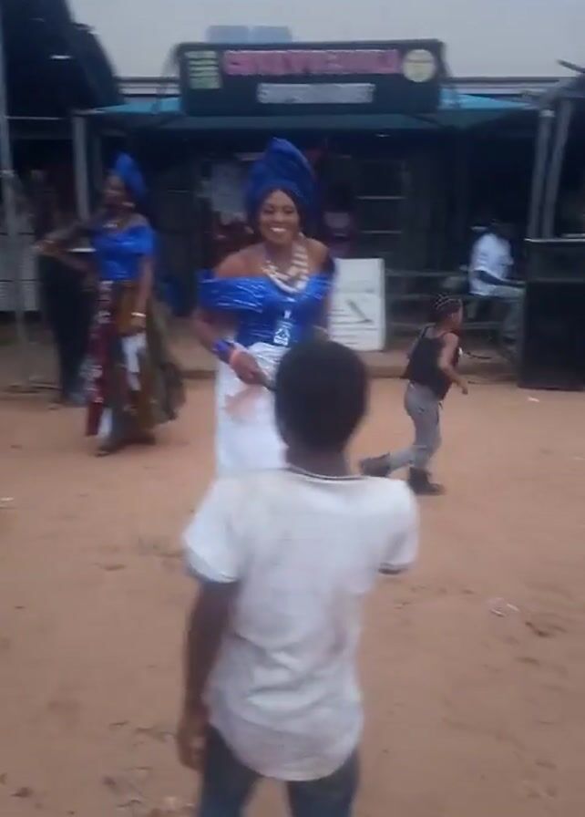 The video depicts a group of women dancing on a dusty, sandy outdoor surface. The dancers are wearing matching blue and white outfits with headwraps. There are at least two women visible in the foreground, moving to music that is audible in the video. A younger person dressed in jeans and a dark shirt appears to be mimicking or dancing alongside them with a small stick. In the background, a building with a sign reading "CHUKWUEMEKA SUPERMARKET" is visible, along with other buildings and people. The overall environment suggests a casual, perhaps celebratory, gathering.