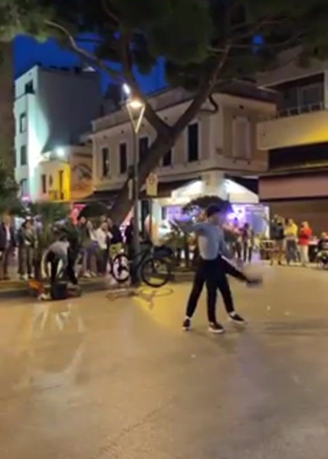Two men are dancing in a town square at night. They are wearing light gray shirts and dark pants. A crowd of people stands watching them. A bicycle is propped up against a pole to the left. Behind the crowd is a building with lights, and further in the background is a taller building lit up in yellow. A large tree is in the foreground, partially obscuring the scene. The pavement is made of large, square stones.