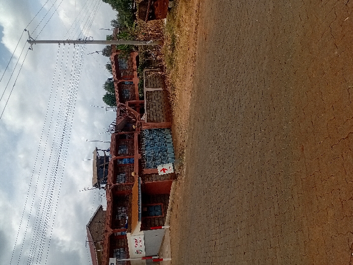This image depicts a multi-story building complex in Karingani ward, Kenya, observed from a low angle across a paved road. The sky is overcast with grey and white clouds. In the foreground, a dark brown interlocking paver road surface is visible, transitioning to reddish-brown dirt on the sides and background. The primary structure is a reddish-brown, brick or stone-clad building complex featuring multiple units with balconies and an external staircase on the right side. On the far left, a portion of another stone-like building is visible. A makeshift or temporary structure with a dark roof is situated on top of the central complex. A low, unpainted brick wall with decorative pillars serves as a boundary for the property, featuring a blue metal gate with a geometric pattern. To the left of the gate, a red and white striped pole or barrier displays a partial white sign with red text, including the word "Hotel." To the right of the gate, affixed to the wall, is a white square sign with a red cross and a red arrow pointing right. On the right side of the frame, a grey utility pole supports numerous horizontal black electrical wires that crisscross the upper portion of the image. A large, dark-colored bin or container is situated on the far right edge of the dirt path. Green foliage from trees and bushes is visible in the background behind the building complex. No individuals are present.