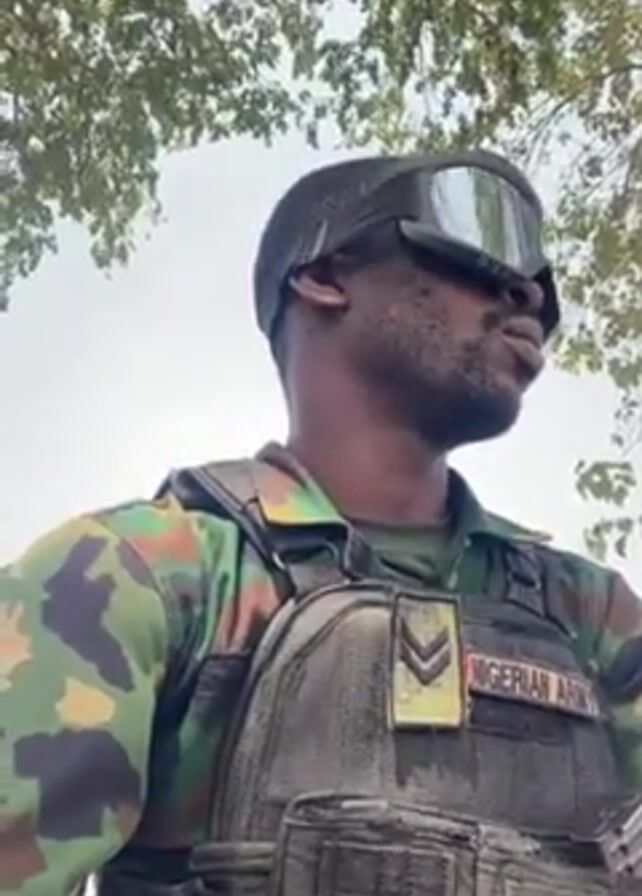 A man in a Nigerian Army uniform stands outside under a tree, looking upwards. He is wearing goggles and a tactical vest. The sky is visible through the branches of the tree. The man appears to be speaking or mouthing words silently.