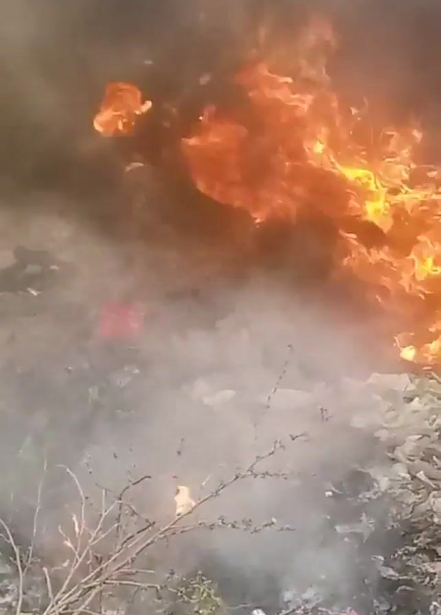 large fire burning in a pile of debris. Flames are visible on the right of the screen, obscured by gray smoke. Branches are visible in the foreground. The debris appears to be burning vigorously. The sky is overcast, and the light is dim.