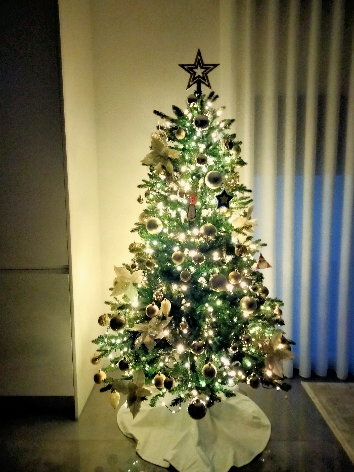 A well-lit Christmas tree adorned with gold ornaments and floral decorations stands in a room. The tree is topped with a black star. A white tree skirt sits at its base. The tree is positioned near a white wall and a set of vertical blinds that have a blue tint. A dark cabinet is to the left, creating a stark contrast to the rest of the image.