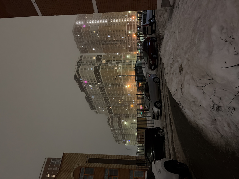 At night, a view from between brick buildings of towering apartment complexes. Lights illuminate many windows, piercing through a layer of fog. Parked cars line the side of a snow-covered street and sidewalk. A metal fence separates the sidewalk from the street, while a strip of pavement divides the street and sidewalk.