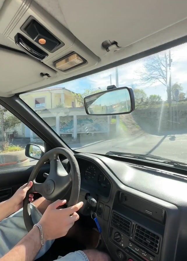 driver’s perspective from inside an older car, likely a Peugeot, with a gray interior. A young man with short, dark hair, wearing a white T-shirt with “C.P. COMPANY” visible and light blue jean shorts, is driving. He has a silver bracelet on his left wrist. The car is moving through a town or rural area on a sunny day. The man drives down the road, then waves his hand across the steering wheel. A bus stop is visible on the right side of the road.