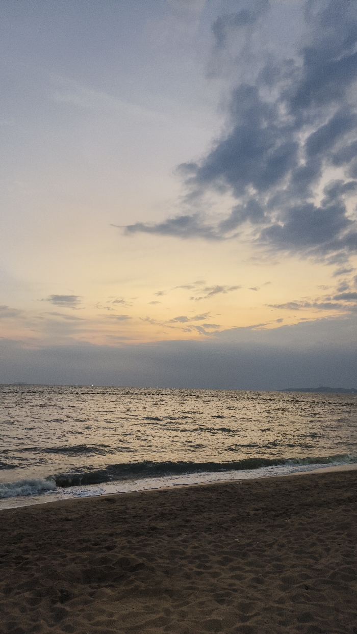 The image depicts a panoramic view of a beach and ocean at dusk or dawn. The foreground consists of dark, fine-grained sand with subtle textures, occupying the bottom third of the frame. Immediately beyond the sand, the ocean displays gentle waves, with a small wave breaking into white foam at the water's edge on the left. The water's surface reflects the sky, appearing warm golden-brown closer to the horizon and darker gray elsewhere. A horizontal line of dark, circular objects, consistent with buoys, stretches across the mid-distance of the water. In the far distance on the horizon, several small, indistinct points of light are visible, along with a faint, low-lying landmass on the right. The sky transitions from a pale yellow-orange at the horizon to a lighter blue-gray overhead. Scattered cumulus clouds, darker gray and more concentrated on the right side of the frame, are present. No people or artificial structures are visible on the beach or in the immediate vicinity. The location is an unknown city, unknown region.