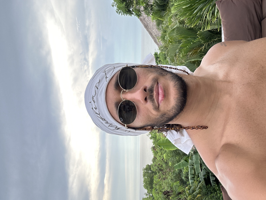 A male individual is depicted in a close-up, chest-up portrait taken outdoors in Uluwatu, Indonesia. The subject, shirtless, features a beard and mustache and looks directly at the camera with a neutral expression. He wears oval-shaped, dark-lensed Ray-Ban sunglasses with thin gold-colored frames, from which a brown, chain-link style glasses strap descends on both sides. A white headscarf, adorned with faint light-colored script, covers his head. A reddish discoloration is present on the right side of his upper lip. The background reveals an overcast sky above a discernible ocean horizon, with dense green tropical vegetation occupying the middle ground, indicating an elevated vantage point. A small portion of a thatched roof is visible through the foliage on the far right, and a brown outdoor cushion is partially visible in the lower right foreground.