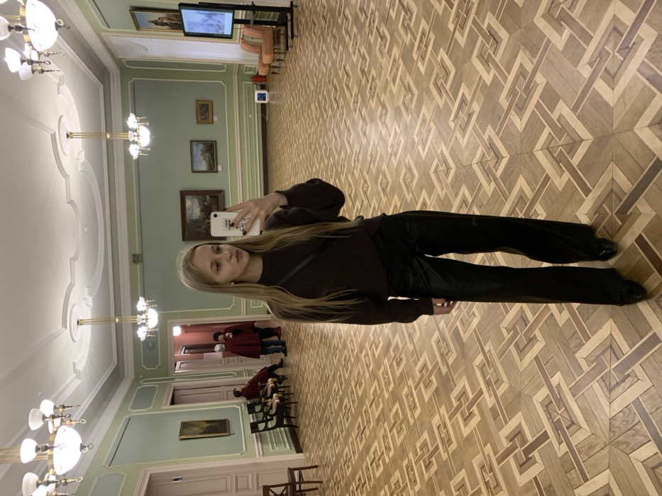 The image depicts a grand hall within the Lviv National Art Gallery in Lviv, Ukraine. In the foreground, a young female with long, straight blonde hair stands centrally, facing forward. She wears a dark brown ribbed sweater, black shiny wide-leg trousers, and black shoes. She holds a white smartphone with a decorative case in her right hand, reflecting her image in a mirror selfie. A black cross-body strap is visible over her left shoulder. Her expression is neutral. The room features a high ceiling with intricate white plasterwork and multiple ornate brass-colored chandeliers with white glass globes. The walls are painted a light pastel green with white decorative moldings along the top and bottom. The floor is a distinctive, multi-toned wooden parquet with a complex geometric pattern. In the mid-ground to the left, near an open doorway, two individuals are visible. One person wears a dark red or burgundy coat/cape and appears to be standing. Another person is seated on one of two dark wooden chairs with upholstered seats. A framed painting hangs on the wall in this section. In the mid-ground to the right, several framed landscape paintings are displayed on the wall. A modern flat-screen display on a black stand is positioned near two light orange or peach upholstered armchairs. A small white rectangular appliance rests on the floor next to the armchairs, and two red fire extinguishers are visible on the floor nearby. The room is brightly lit.
