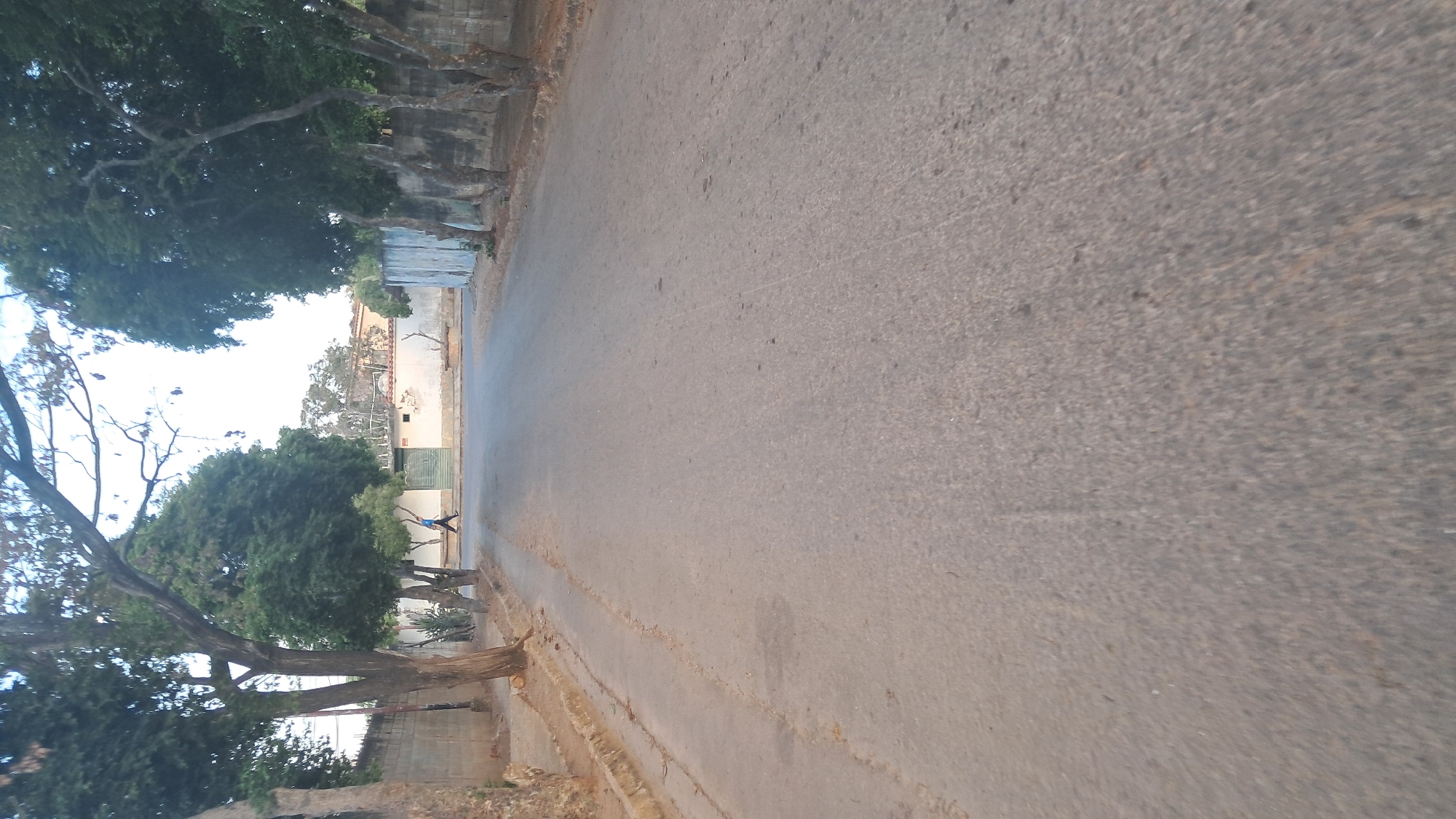 The image depicts a street in Juan Griego, Venezuela. The road surface is grey asphalt, displaying signs of wear. Trees line the left side of the street, providing shade. A person is walking in the distance on the left side of the street. Buildings and fences are visible along the edges of the street. The sky is light, suggesting daylight.