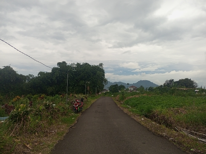 A paved road stretches into the distance under a cloudy sky. Lush greenery flanks both sides of the road, transitioning into dense trees. A red motorbike is parked to the left. A house is visible amidst the trees. Distant mountains are visible in the background. Utility lines run above the trees on the left. Vegetation consists of tall grasses and various plants. The road appears to be lightly traveled.