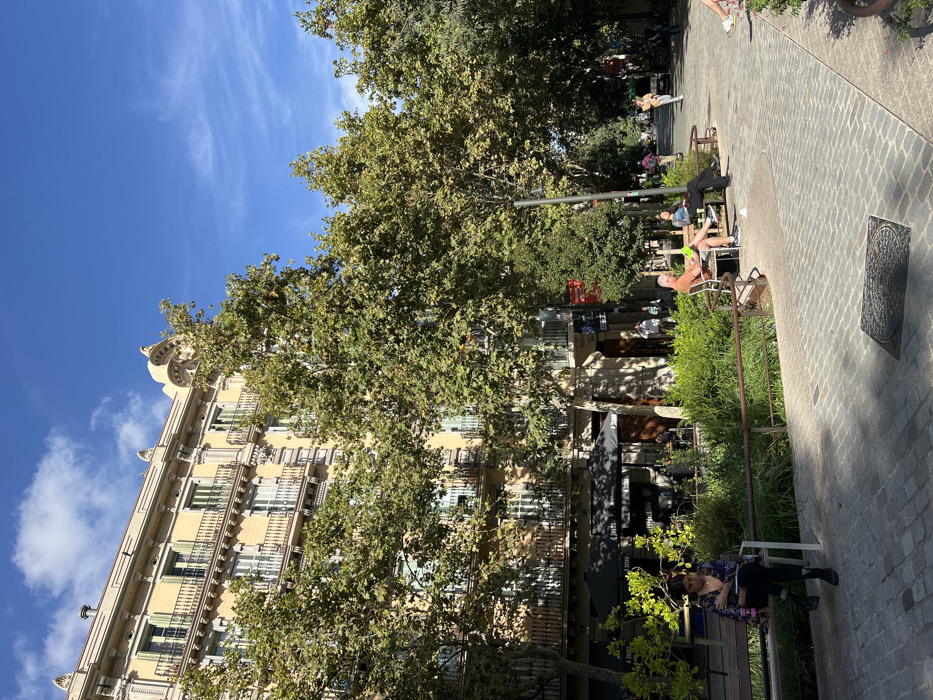 The image displays a sunlit urban promenade on Carrer de Montsió in Barcelona, Spain. A prominent multi-story, light-yellow classical building with ornate balconies, black railings, and green-shuttered windows forms the backdrop, partially obscured by numerous mature trees with dense green foliage. The sky above is clear blue with scattered white cirrus clouds. In the foreground left, a female individual with dark hair, wearing a patterned long-sleeved top and dark trousers, is seated on a wooden bench, looking downwards at an object in her lap. In the midground right, a male individual with short grey hair, clad in an orange t-shirt and light shorts, is seated on a white chair at a small table, holding a bright green item. Another individual is seated on a wooden bench directly behind him. Further down the tree-lined, cobblestone-paved promenade, multiple pedestrians are visible walking, including one operating an electric scooter. The ground floor of the main building features the "4 Gats" cafe, identifiable by its black awning and outdoor seating area with tables and chairs. Green shrubbery and grasses are present in raised planters along the walkway. A dark, circular manhole cover is visible on the foreground pavement, which is composed of light-colored pavers.