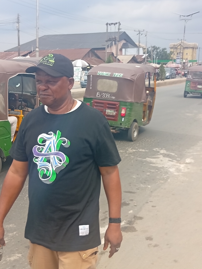 A middle-aged man stands on a paved road wearing a black t-shirt with a large decorative "A" and a black baseball cap. Behind him are three auto-rickshaws, one brown and green and two green, parked along the side of the road. Buildings are visible in the background, including one with a roof that slopes upward. A street light is visible on the right side of the background.