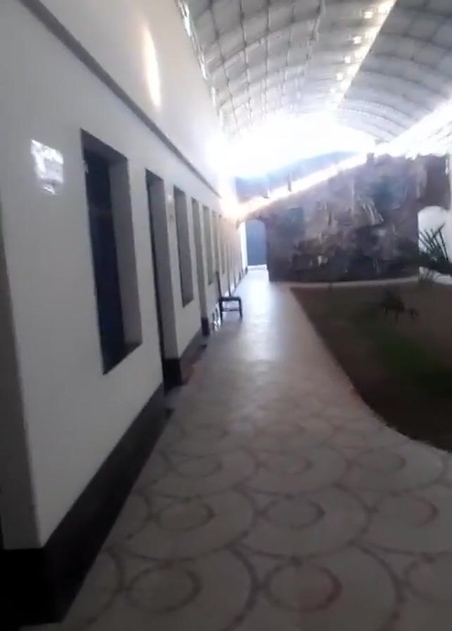 long hallway with an arched, corrugated metal ceiling. On one side, there are multiple windows with black frames. On the other side, there is an open area with plants and a rock formation. The floor is covered in patterned tiles. The person filming is walking through the hallway.