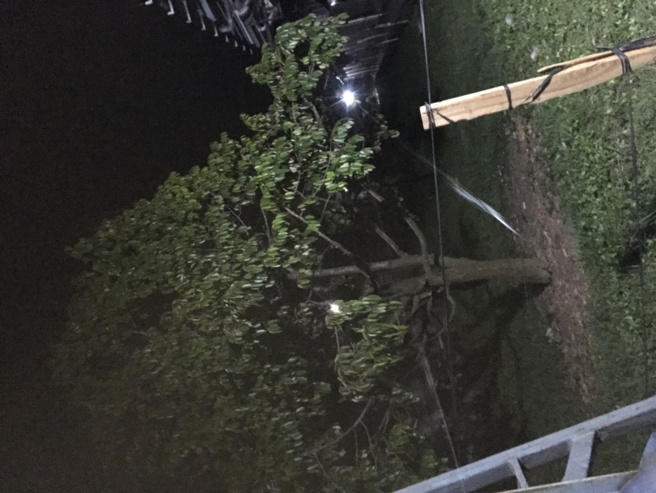 This nighttime image depicts an outdoor scene in Margorejo, Indonesia. A large tree with dense green foliage occupies the center-left, illuminated from behind by artificial light sources visible in the distant background. The ground around the tree's base consists of darker soil or mulch, transitioning to green grass in the foreground. In the immediate foreground on the left, a portion of a gray metallic ladder or scaffolding is visible. On the right foreground, a light-colored wooden post, with dark material wrapped around it, stands vertically. A dark wire or rope extends horizontally from this post towards the left, across the lower mid-ground. A bright, elongated streak of light is observed diagonally below this wire, between the tree and the wooden post. In the far background on the right, a structure with discernible multi-tiered or peaked rooflines is partially visible against the dark sky. No individuals are present.