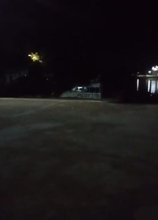 dark scene at night. A building with the word "PILOT" on it is visible in the foreground, towards the left side. In the background, across what appears to be a body of water, there's a structure with lights reflecting on the water. The lights suggest the presence of a bridge or a building illuminated at night. The right side of the view is primarily dark, possibly a wall or ground surface.