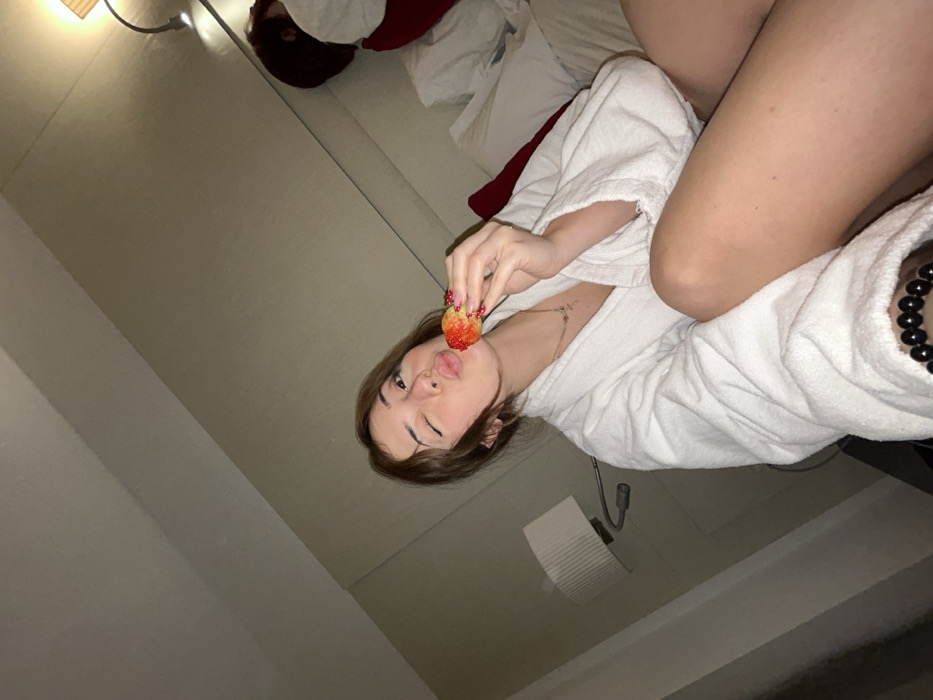 A young woman in a white robe is propped up in bed with white pillows and a red blanket. She winks and holds a strawberry to her lips. She wears a delicate necklace. Part of another person's head is visible at the top of the frame. A small lamp is on the wall. The angle is tilted, creating a casual, candid effect.