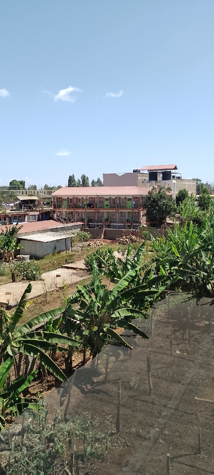The image displays an outdoor scene in Karingani ward, Kenya, viewed under a clear blue sky with a few sparse white clouds. The foreground consists of dark, tilled earth with visible small green plants, potentially maize, and several upright wooden stakes. A translucent dark net partially obscures this area. The midground is characterized by dense clusters of banana trees with large green leaves. Beyond these, segments of bare earth, concrete slab foundations, and piles of cut wood are present. A small, light-colored corrugated metal shed with a reddish-brown roof stands among these elements. In the background, a prominent three-story building with a reddish-brown corrugated metal roof is visible. It features numerous balconies with wooden railings and light green doors or windows. To its left, several smaller structures with red roofs are apparent, some exhibiting clotheslines with laundry. To the right of the main building, an unfinished multi-story concrete structure stands, topped with two large black water tanks covered by a smaller reddish canopy. Further back, a treeline extends towards the horizon. No individuals are discernibly depicted within the scene.