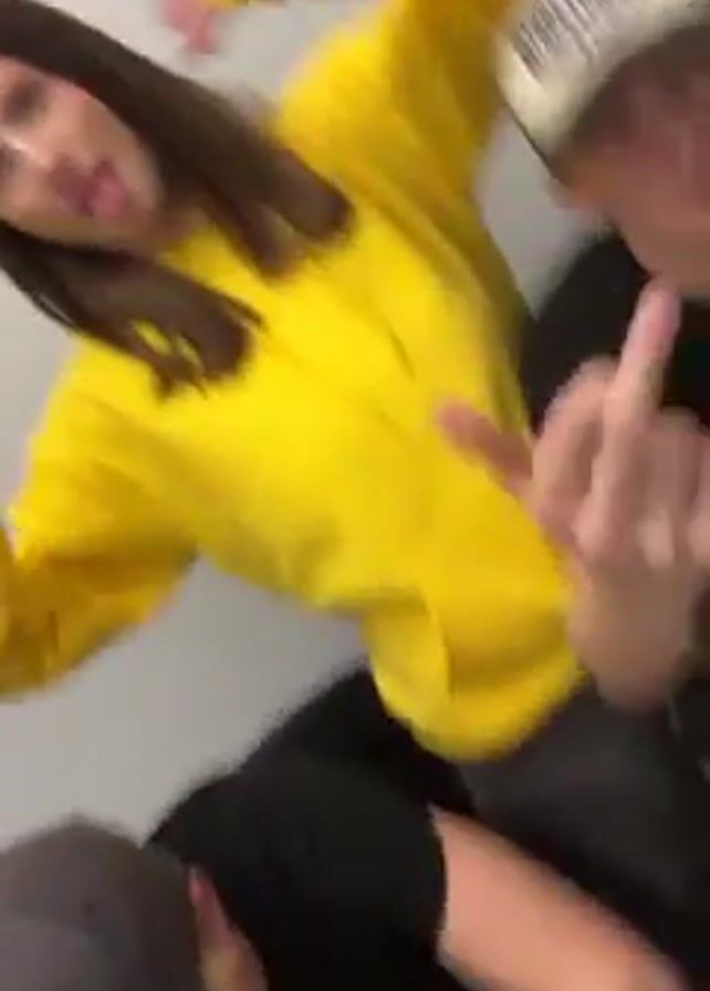 woman in a yellow hoodie standing next to a person in a black shirt and a baseball cap. There are two other people present, one wearing a grey cap and the other wearing a yellow hoodie. All four are at a desk, and the woman and the person in the black shirt make gestures toward the camera. The camera moves around the group, losing focus at times. Objects on the desk include a knife, a phone, a pen, and what appears to be a vape pen.