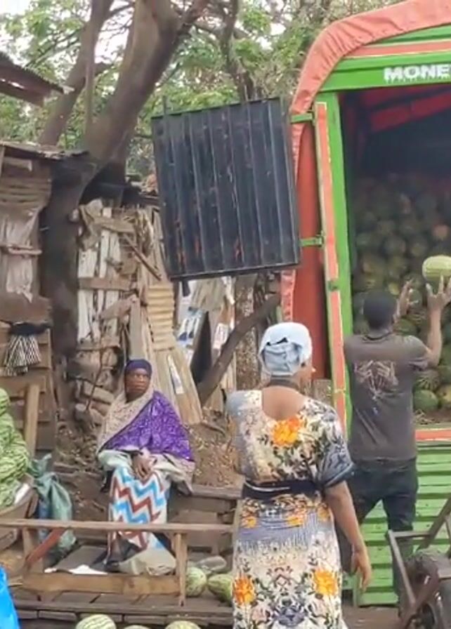 A truck is parked at a roadside watermelon stand. The truck bed is full of watermelons, and several people are loading them off the truck and onto a handcart. A woman sits on a wooden chair beside stacks of watermelons, while a few people stand around watching. The stand is made of wood and metal, with a makeshift roof. The truck has the words "MONEY TALKS" written on the top of the back. There are trees and buildings in the background.