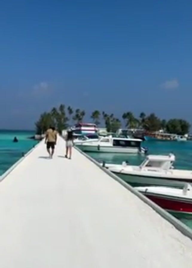 man and a woman walking away from the camera on a white pier, towards a small, tree-covered island in the distance. The water on either side of the pier is a clear turquoise color. Boats are docked on the right side of the pier. On the left side of the pier, there is a jet ski in the water, and further out, a floating inflatable obstacle course with red, white, and blue elements. The sky is clear and blue.