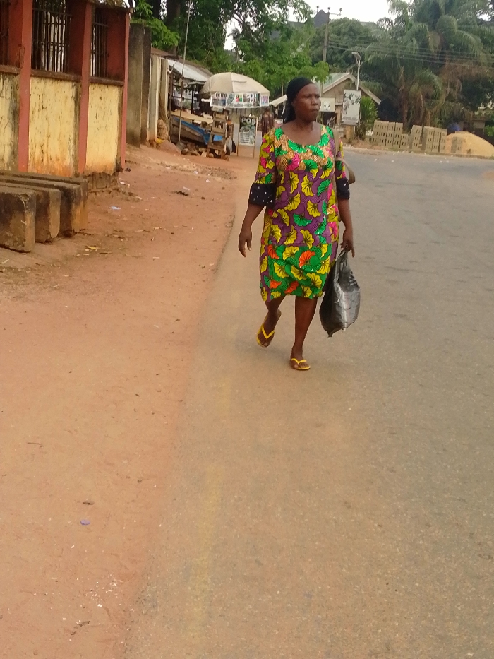 This image depicts an outdoor street scene in Umuoji, Nigeria, under overcast conditions. In the foreground, a dark-skinned adult female walks from left to right on an asphalt road, facing slightly right of the camera's perspective. She wears a vibrant, short-sleeved dress with a green, purple, yellow, and orange floral or leaf pattern, black and white polka dot cuffs, a dark headscarf, and yellow flip-flops. Her left hand holds a dark-colored plastic bag. To the immediate left of the asphalt road is a reddish-brown dirt shoulder. Along this shoulder, in the midground, a building with a yellow base and reddish-brown upper section, featuring a metal-barred window, is visible. Three large, rectangular concrete blocks are stacked on the dirt in front of this building. Further down the road on the dirt shoulder, several market stalls or small shops are present, one with a white canopy and a "POS" sign. Another individual is faintly visible near these stalls. In the background, stacks of red bricks or concrete blocks are piled on the right side of the road, and abundant green trees and vegetation line the horizon. Utility poles and power lines are visible overhead. The overall environment suggests a bustling, semi-urban or rural commercial area.